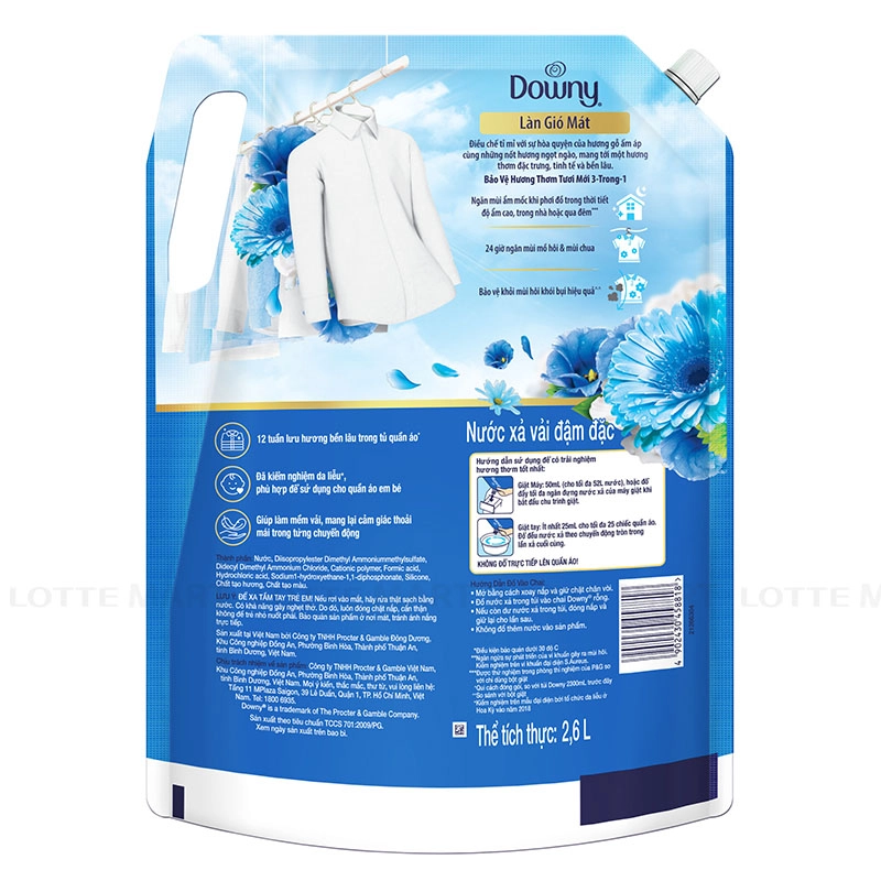 Nước Xả Vải Downy Làn Gió Mát Túi 2.3L với hương thơm tươi mát sẽ giúp đánh tan những mùi khó chịu trên quần áo, lưu lại hương thơm trên từng thớ vải, cho bạn tự tin hơn mỗi khi xuất hiện. Mang đến mùi hương sảng khoái mát mẻ, không chỉ lưu hương lâu đến 2 tuần mà còn giúp chống lại 10 mùi ô nhiễm khó chịu nhất như thuốc lá và bụi xe,...