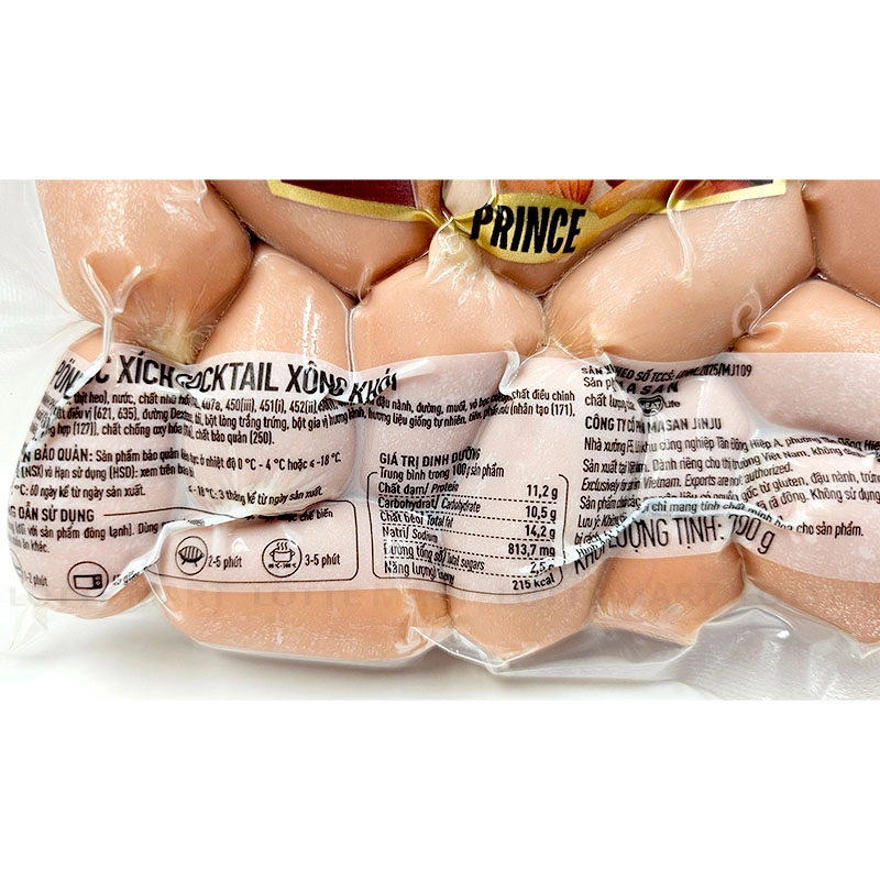 - Thịt (thịt gà, thịt heo), nước, chất nhũ hóa (1422, 407a, 450(ii), 451(0. 452(i), 4500), đường, vỏ bọc collagen, đam đậu nành, muối, chất điều vị (621, 635), đường Dextrose, tỏi, bột lòng trắng trứng, hương liệu giống tự nhiên, bột gia vị hương hành, tiêu, phẩm màu nhân tạo, phẩm màu tổng hợp, chất chống oxy hóa, chất bảo quản.