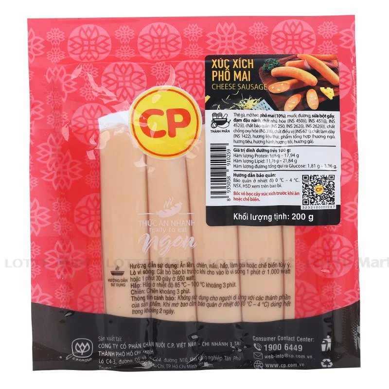 Xúc Xích Phô Mai CP Gói 200g với nguồn nguyên liệu này được chọn lọc kĩ càng, chế biến trên dây chuyền hiện đại.