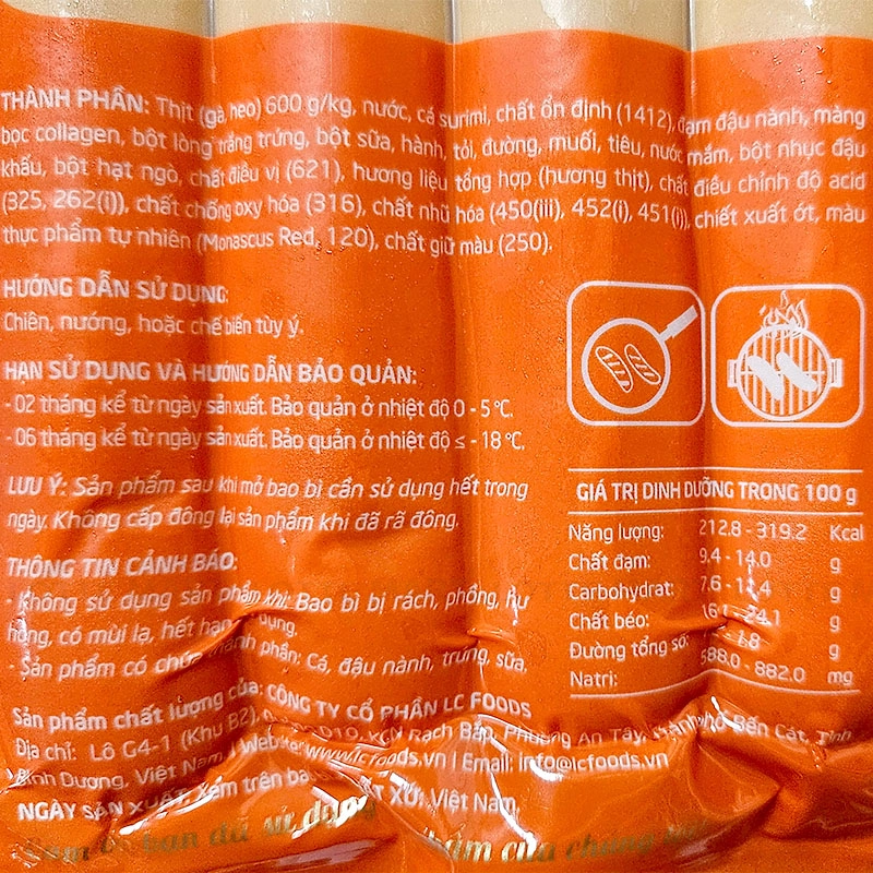 - Thịt (gà, heo), nước, chất ổn định (1412), đạm đậu nành, màng bọc collagen, bột lòng trắng trứng, bột sữa, hành, tỏi, đường, muối, tiêu, nước mắm, bột nhục đậu khấu, bột hạt ngò, bột cá, chất điều vị (621), hương liệu tổng hợp (hương thịt), chất điều chỉnh độ acid (325, 262(i)), chất chống oxy hóa (316), chất nhũ hóa (450(iii), 452(i), 451(i)), chiết xuất ớt, màu thực phẩm tự nhiên Monascus Red, chất bảo quản (250), màu thực phẩm tổng hợp (120).