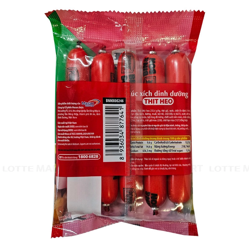 - Xúc Xích Tiệt Trùng Heo Ponnie Bin&Bon là lựa chọn tiện lợi và dinh dưỡng cho bữa ăn nhẹ. Sản phẩm được chế biến từ thịt heo kết hợp cùng thịt gà, tinh bột, đạm đậu nành và gia vị tự nhiên, mang đến hương vị thơm ngon đậm đà, dễ ăn và phù hợp với mọi lứa tuổi.