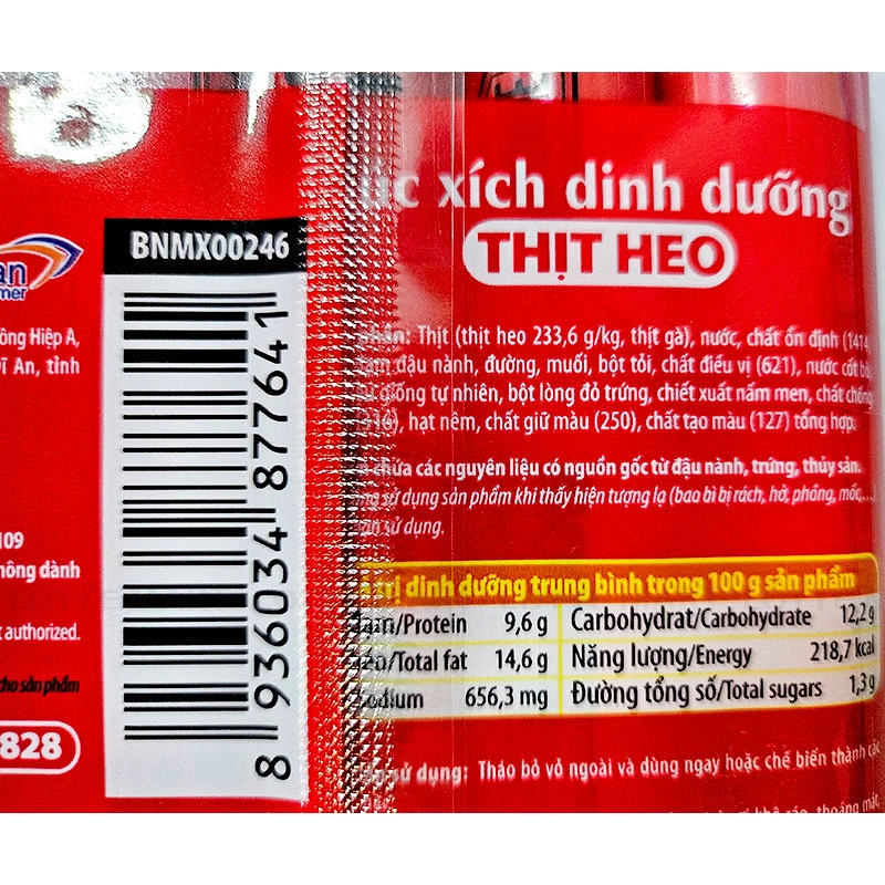- Thịt (thịt heo, thịt gà), nước, chất ổn định, đạm đậu nành, đường, muối, bột tỏi, chất điều vị, nước cốt bò, hương liệu giống tự nhiên, bột lòng đỏ trứng, chiết xuất nấm men, chất chống oxy hóa, hạt nêm, chất giữ màu, chất tạu màu tổng hợp.