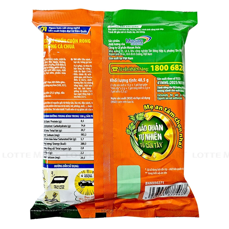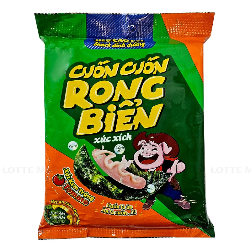 - Xúc Xích Tiệt Trùng Cuốn Cuốn Rong Biển Xốt Kem Trứng Cà Chua Heo Cao Bồi là món ăn vặt tiện lợi, độc đáo, dành cho những ai yêu thích khẩu vị mới lạ và muốn thưởng thức những món cuốn đầy hương vị. Sản phẩm là sự kết hợp hài hòa giữa xúc xích heo mềm dai, rong biển thơm nhẹ, lớp hạt giòn vui miệng cùng xốt kem trứng cà chua béo mịn, mang lại trải nghiệm ăn uống phong phú, thú vị.