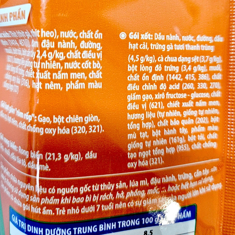 - Sản phẩm chứa nguyên liệu có nguồn gốc từ thủy sản, gluten, đậu nành, trứng, cần tây, sữa.
