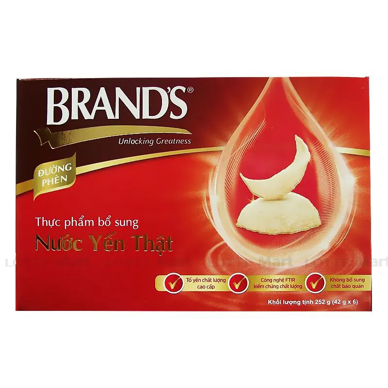 Nước Yến BRAND’S là thực phẩm bổ sung rất tốt cho sức khoẻ. Nước Yến được sử dụng từ loại yến đảo thiên nhiên, hàm lượng yến cao và quy trình nghiêm ngặt đạt chuẩn Châu Âu với sợi yến dài và nguyên để bảo đảm mùi vị và chất lượng gần nhất với yến thô chưng cất tại nhà.