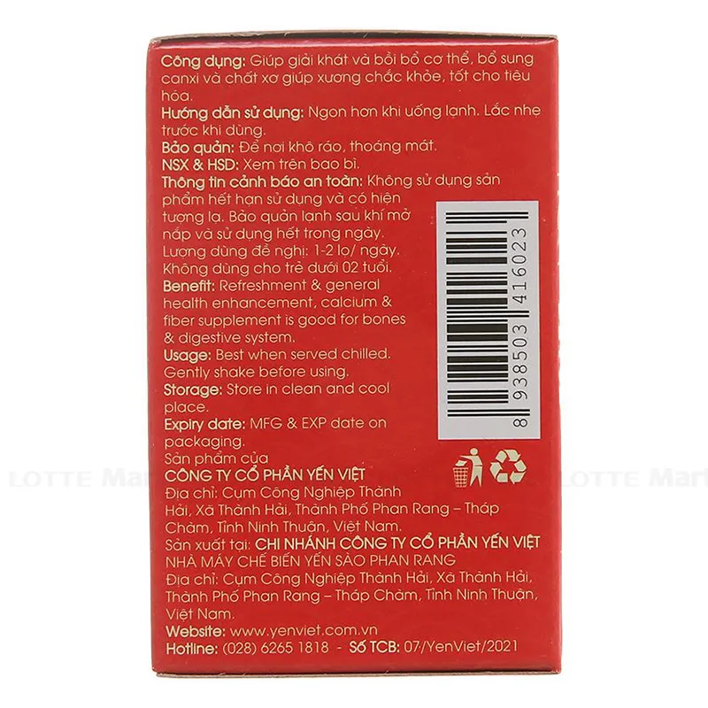 Thành phần dinh dưỡng trong sản phẩm: Thành phần chính của sản phẩm gồm: Tổ yến 15%, Isomalt, chiết xuất cây cỏ ngọt, nước, chất xơ, canix, lactate, agar (ins 406), chất ổn định, hương tổ yến tổng hợp. Ngoài ra, sản phẩm cung cấp khoảng 30 kcal trên 70ml yến.
