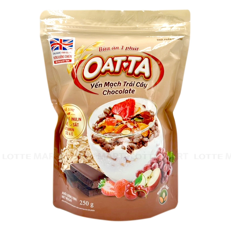 - Yến Mạch Trái Cây Socola Otta là một sự kết hợp tuyệt vời giữa yến mạch nguyên cám và các loại trái cây tươi ngon như cherry, dâu tây, táo và nho, được nhập khẩu từ Úc, New Zealand và Châu Âu. Sản phẩm không chỉ mang lại hương vị thơm ngon mà còn cung cấp nhiều lợi ích dinh dưỡng cho người tiêu dùng, là lựa chọn lý tưởng cho bữa ăn sáng nhanh chóng và bổ dưỡng.