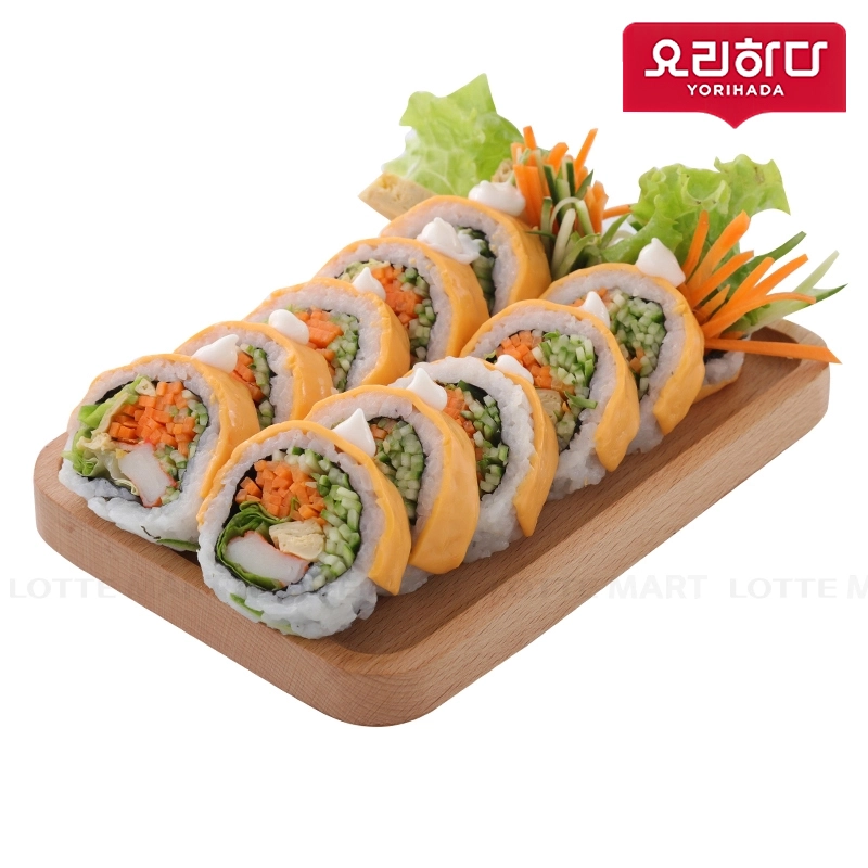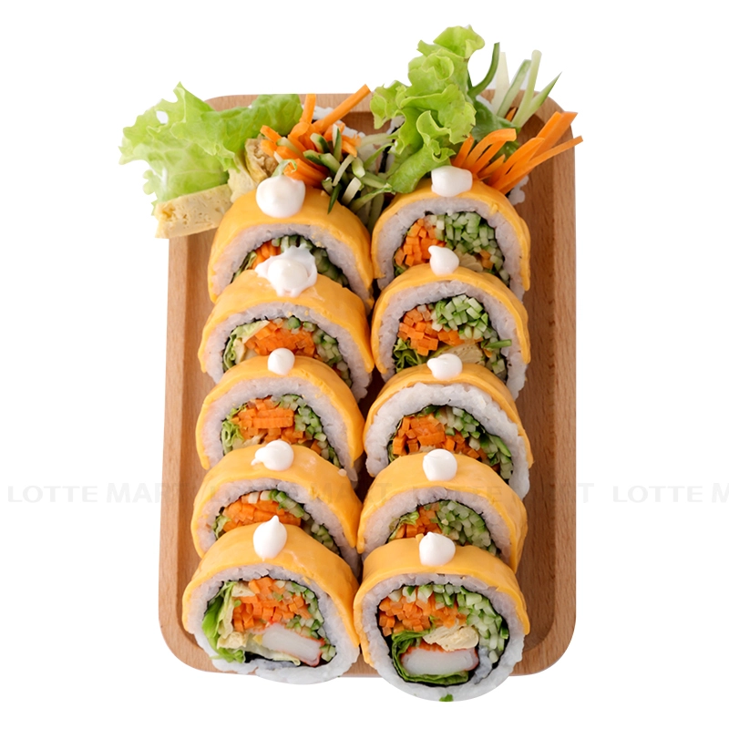 Thành phần: Lá rong biển, thanh trứng tamago, thanh cua, phô mai lát, xà lách lolo, dưa leo, cà rốt xào, cơm sushi.