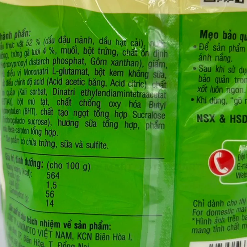 - Dầu thực vật, nước, mạch nha, trứng gà tươi, đường, muối, bột trứng, giấm, chất điều vị Dầu hạt cải, trứng gà tươi, mạch nha, dấm, muối, đường, nước, chất điều vị,...