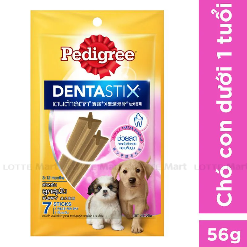 Thành phần: Bột gạo, bột mì, hương vị tự nhiên gia cầm, khói hương vị, vitamin C, A, D, D3, B2, B12, B6, E và vitamin B1, khoáng chất như canxi, đồng sulfat, kẽm, kali clorua, sắt, nghệ, chiết xuất trà xanh và muối i-ốt. Pedigree DentaStix có hình dạng chữ X của DentaStix làm sạch kẽ răng và lợi chó yêu nhà bạn, trọng lượng 56g phù hợp cho những chú chó nhỏ, giúp chúng có hàm răng sạch sẽ.