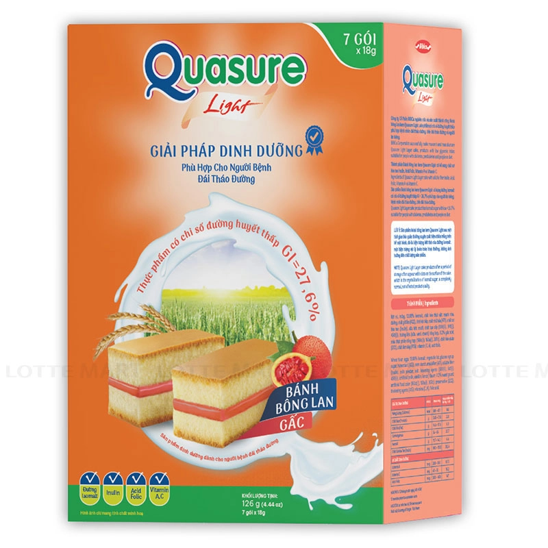 - Bánh Bông Lan Quasure Light Vị Gấc mang đến hương vị thơm ngon, ngọt nhẹ và màu sắc hấp dẫn, đồng thời được bổ sung chất xơ hòa tan Inulin, Acid Folic, Vitamin A và Vitamin C, hỗ trợ sức khỏe và tăng cường hệ miễn dịch.