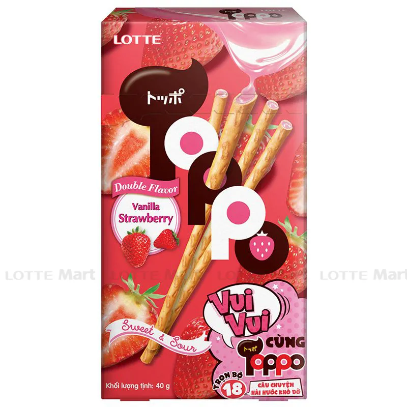 Bánh Que Toppo Nhân Kem Dâu là sản phẩm được sản xuất trên dây chuyền hiện đại của Thái Lan. Bánh có vị giòn tan của lớp vỏ bên ngoài, bên trong nhân kem dâu hấp dẫn.