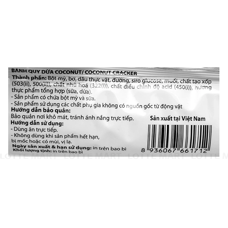 - Bột mì, bơ, dầu thực vật, đường, siro glucose, muối, chất tạo xốp, chất nhũ hóa, chất điều chỉnh độ acid, hương thực phẩm sữa, dừa tổng hợp