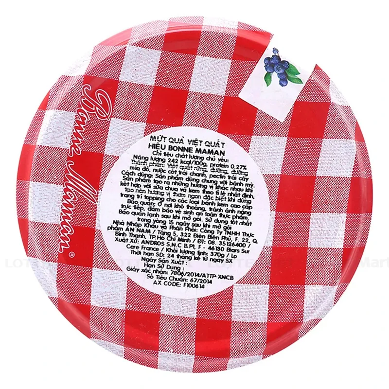 - Mứt Quả Việt Quất Bonne Maman là sản phẩm được chiết xuất từ những quả việt quất được lựa chọn kỹ lưỡng, đảm bảo chất lượng tươi mọng, thơm ngon. Cùng với đó là một số nguyên liệu tự nhiên khác là đường, đường mía, pectin trái cây, nước cốt trái chanh. Tất cả được sản xuất với công thức gia truyền bằng công nghệ hiện đại theo tỷ lệ hợp lý nhằm mang đến hương vị tự nhiên và giữ được giá trị dinh dưỡng nhiều nhất.