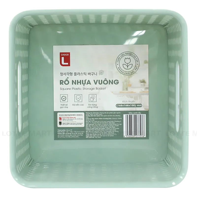 - Rổ Nhựa Hình Vuông Màu Xanh Rêu Choice L 16.8 x 16.8 x 10cm với chất lượng tuyệt vời, được sản xuất từ chất liệu nhựa PP chắc chắn và an toàn. Rổ nhựa hình vuông tiện lợi, có thể sử dụng với nhiều mục đích khác nhau như đựng đồ dùng sinh hoạt hoặc đựng các loại rau củ quả.
