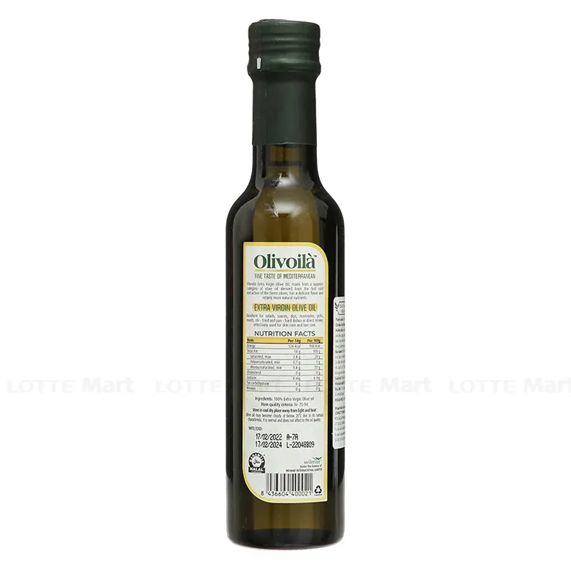 Dầu Olive Nguyên Chất Olivoilà Extra Virgin Chai 250ml được sản xuất bằng phương pháp chiết xuất ép lạnh trong vòng 24h đầu (được công nhận rộng rãi là phương pháp sản xuất loại dầu ô-liu ngon nhất), thuộc nhóm cao cấp nhất trong các loại dầu ô-liu, có độ axít ≤ 0,8% phù hợp với tiêu chuẩn dầu ô-liu nguyên chất ép lạnh quốc tế, đảm bảo lưu giữ các vitamin, hợp chất Polyphenol chống ô-xi hóa có tác dụng làm chậm quá trình lão hóa, giảm nguy cơ mắc các bệnh tim mạch, hiệu quả trong việc chăm sóc làn da và mái tóc.