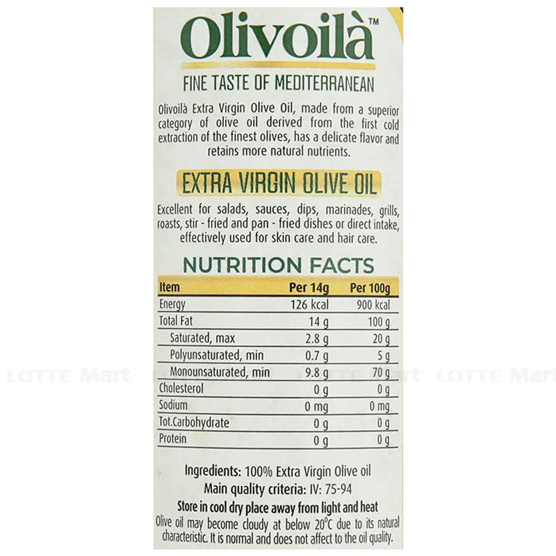 - Trung bình trong 100g dầu olive Extra Virgin của thương hiệu Olivoilà có chứa khoảng 900 calo.