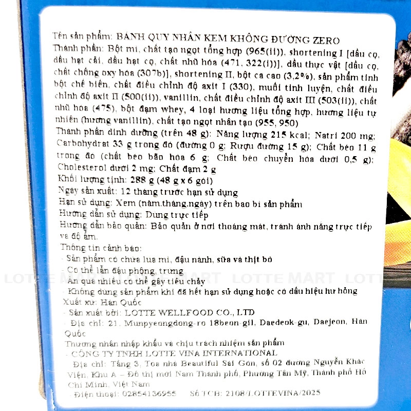 - Bánh Quy Nhân Kem Lotte Cream Zero là sản phẩm lý tưởng cho những người đang ăn kiêng hoặc mắc bệnh tiểu đường. Với hương vị kem vani phết giữa hai chiếc bánh quy cacao giòn, sản phẩm này mang đến trải nghiệm ngọt ngào mà không lo về lượng đường và carb.