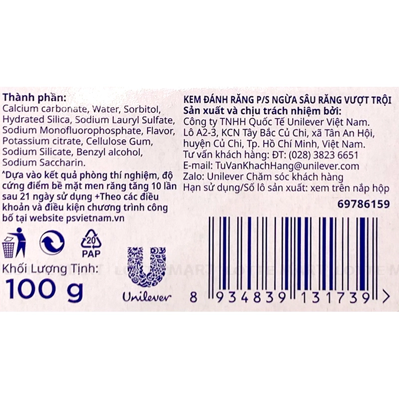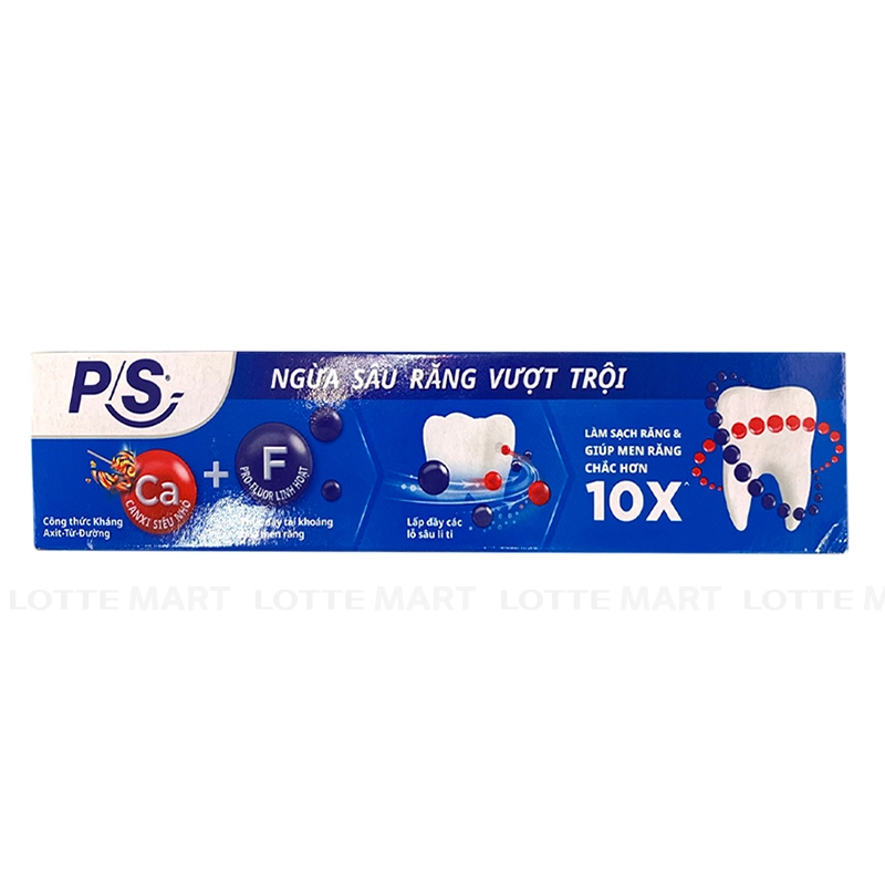 Kem Đánh Răng P/S Ngừa Sâu Răng Vượt Trội được kiểm chứng khoa học với can-xi siêu nhỏ và pro-fluor linh hoạt: Giúp lấp đầy các lỗ sâu li ti trước khi chúng trở thành sâu răng. Tạo một lớp bảo vệ vượt trội giúp răng chắc hơn 10 lần. Thành phần: Calcium Carbonate, Water, Sorbitol, Hydrated Silica, Sodium Lauryl Sulfate, Flavor, Sodium Monofluorophosphate, Cellulose Gum, Sodium Silicate, Potassium Citrate, Benzyl Alcohol, Sodium Saccharin.