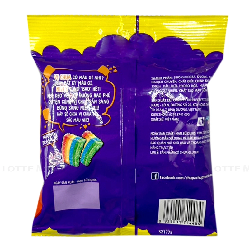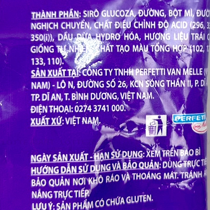 Thành phần: Đường, siro glucoza, bột mì, chất điều chỉnh độ acid, acid citric, dầu thực vật hydro hoá (dầu dừa, dầu hướng dương), hương trái cây giống tự nhiên, màu tổng hợp,...