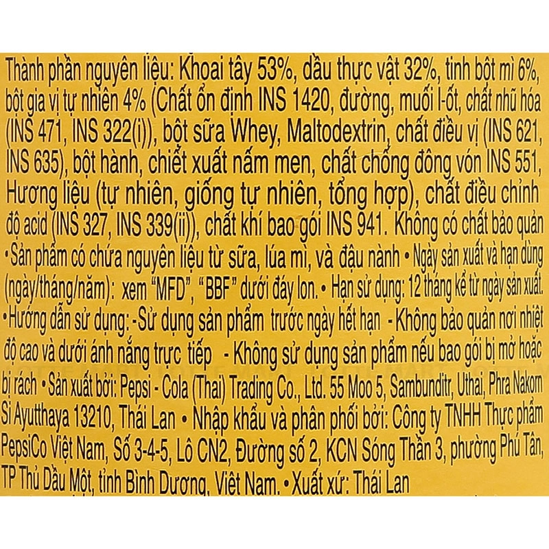 - Khoai tây 52%, dầu thực vật 32%, tinh bột mì 6%, bột gia vị tự nhiên 4%,…(Chi tiết trong HSCB).