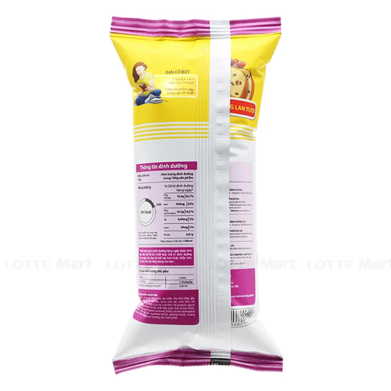 - Bột mì, đường, trứng gà (14%), dầu cọ, chất giữ ẩm, nho khô (5%), chất nhũ hoá, bột trứng, chất tạo xốp, bột whey, hương thực phẩm tổng hợp (sữa, bơ), muối, bột bắp, chất bảo quản, chất điều chỉnh độ acid, bột quế, chất ổn định, chanh.