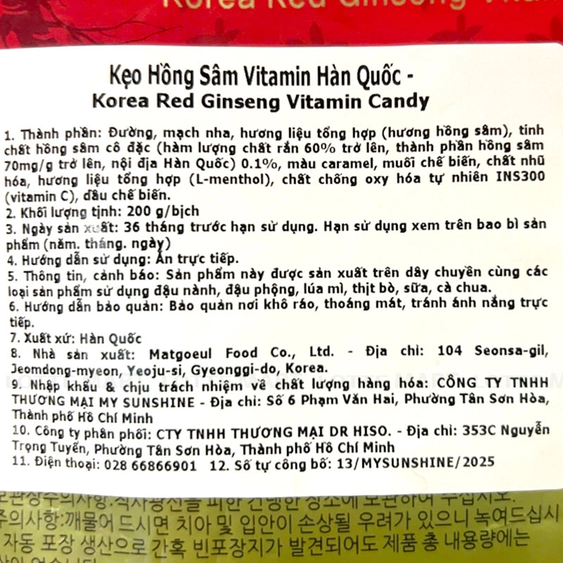 Kẹo Hồng Sâm Vitamin Hàn Quốc Matgoeul Gói 200G