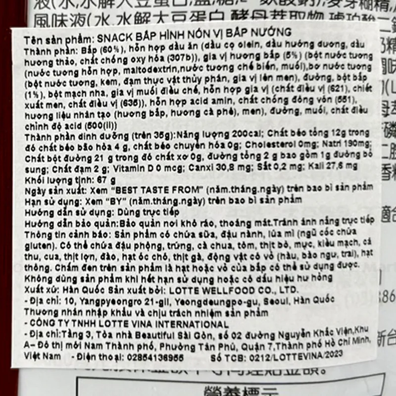 - Snack Bắp Hình Nón Lotte Vị Bắp Nướng Gói 67G là một món ăn nhẹ mang hương vị thơm ngon của bắp nguyên bản, kết cấu bánh giòn vè hình dáng chiếc nón vừa với ngón tay. Bánh thích hợp làm món ăn vặt làm mê mẩn biết bao thế hệ.
