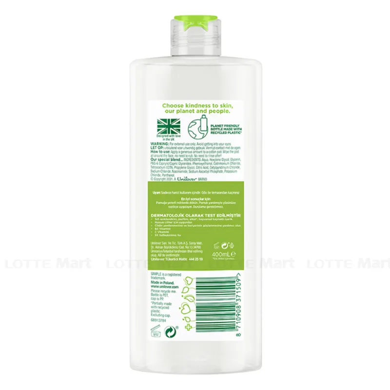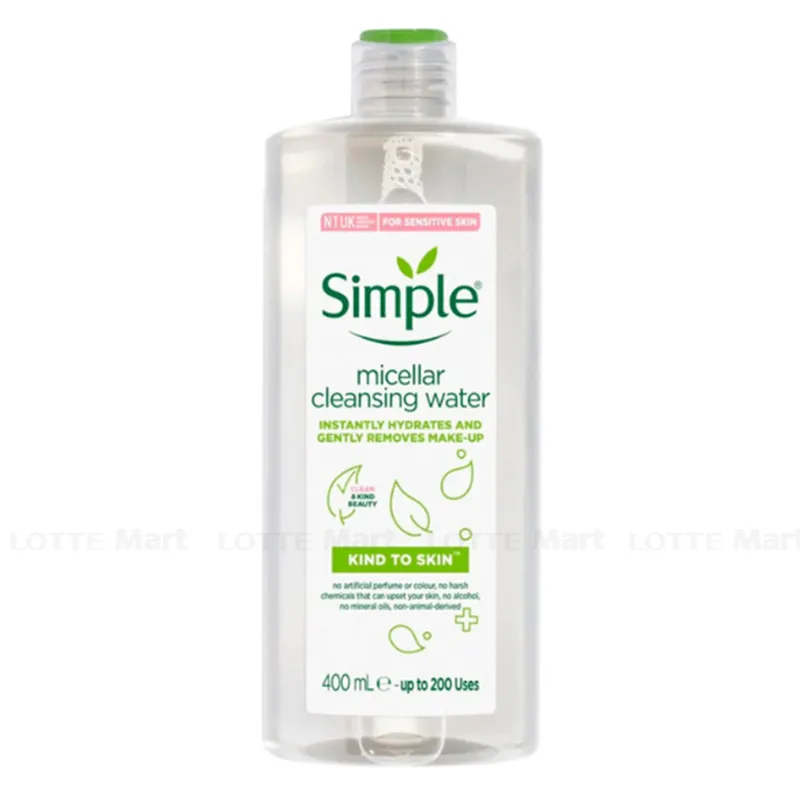 Nước Tẩy Trang Simple Dịu Nhẹ Làm Sạch Lớp Trang Điểm Và Cấp Ẩm Cho Da 400ml là nước tẩy trang sử dụng công nghệ Micellar hiệu quả và tiên tiến. Những hạt bong bóng nước Micelles thông minh nhẹ nhàng đi sâu vào da để lấy đi những bụi bẩn, lớp trang điểm cứng đầu đồng thời đưa vào da những dưỡng chất và độ ẩm cần thiết, cấp ẩm tức thì cho làn da lên đến 90%.
