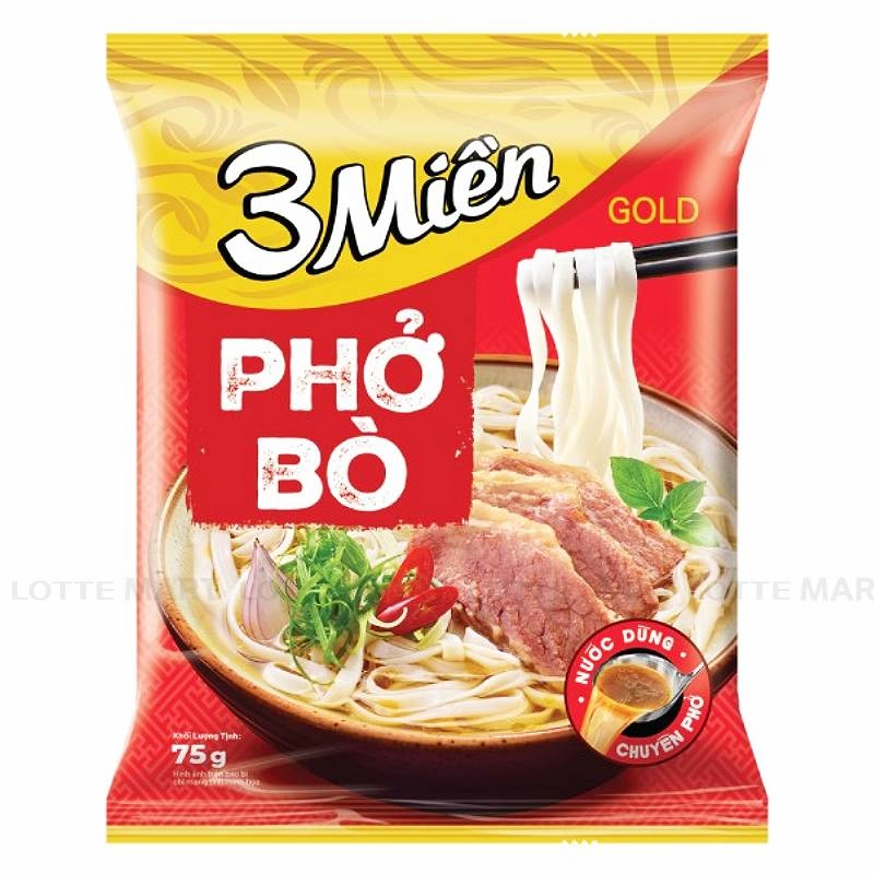 - Phở Bò 3 Miền Gold tinh tế với sợi phở thơm ngon, mềm kết hợp cùng túi nước dùng chuyên phở, là sự kết hợp công phu giữa thịt và xương ống được ninh nhiều giờ với hành ta, gừng, hồi, quế, thảo quả nướng lên để có được mùi thơm và tăng vị béo, ngọt, cho ra tô phở đậm đà vị truyền thống.