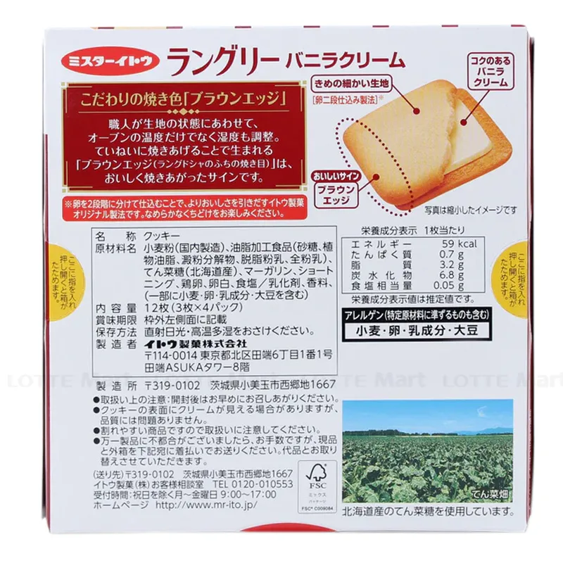Bánh Quy Languly Kem Vani được nướng cẩn thận bằng cách điều chỉnh không chỉ nhiệt độ lò mà còn cả độ ẩm tùy theo tình trạng của bột. Do đó, các mép màu nâu xuất hiện trên chiếc bánh là dấu hiệu cho thấy bột đã được nướng một cách thành công, đảm bảo vị ngon và kết cấu giòn.