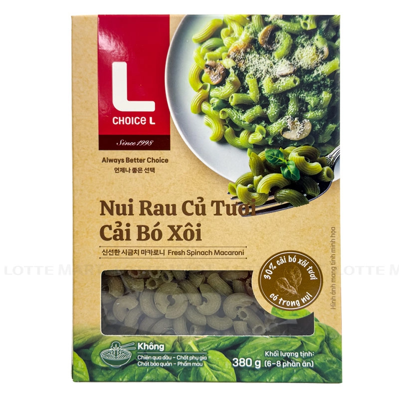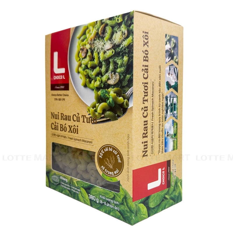 - Nui Rau Củ Tươi Cải Bó Xôi Choice L Hộp 380G là một thực phẩm khô bổ dưỡng và tiện lợi, với thành phần chính từ bột gạo và tinh chất rau củ, thành phẩm miếng nui dai, mềm khi chế biến.