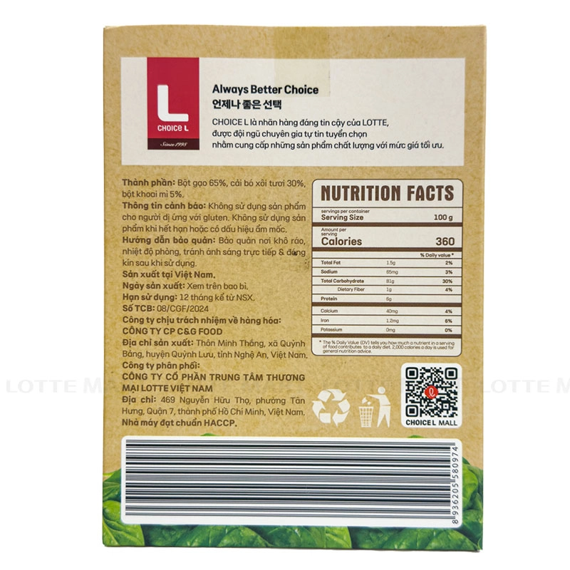 - Bột gạo 65%, cải bó xôi tươi 30%, bột khoai mì 5%