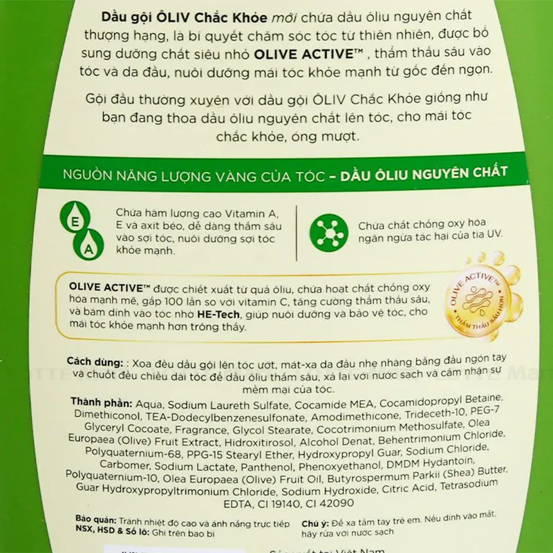 - Hướng dẫn sử dụng: Cho một lượng dầu gội vừa đủ lên tóc đã ướt, mát-xa da đầu nhẹ nhàng bằng đầu ngón tay và chuốt đều chiều dài tóc để dầu Ôliv thấm sâu, xả lại với nước sạch và cảm nhận sự mềm mại của tóc. Bảo quản ở nhiệt độ phòng và tránh ánh nắng trực tiếp.