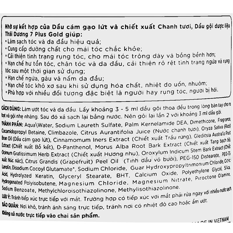 - Dầu Gội Thái Dương 7 Hoa Bưởi Tây kết hợp dầu cám gạo lứt và tinh dầu vỏ bưởi giúp sạch gàu, duy trì hiệu quả sạch gàu, hết ngứa.