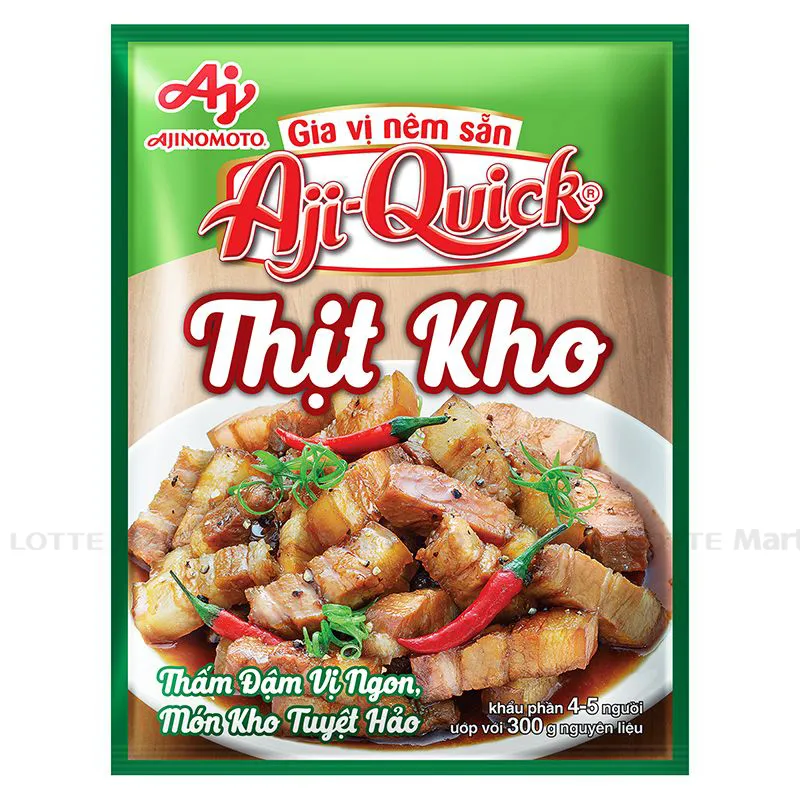 Gia Vị Nêm Sẵn Thịt Kho Aji-Quick Ajinomoto Gói 31G là sự hài hòa của tất cả các loại gia vị cần thiết để nêm nếm tẩm ướp cho món thịt kho thơm ngon đúng điệu một cách nhanh chóng mà không tốn thời gian để nấu. Thành phần: Đường, muối, chất điều vị, bột nước mắm, chất chống đông vón, chất ổn định, hương tổng hợp, tiêu, tỏi, phẩm màu. Công dụng: Dùng để nêm nếm món thịt kho. Bảo quản ở nơi khô thoáng, tránh ánh nắng trực tiếp.