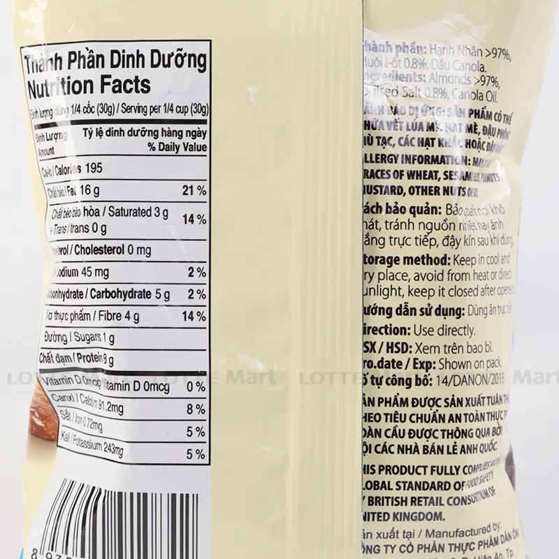 Thành phần: Hạnh nhân 98,5%, dầu thực vật, muối 0,5%.