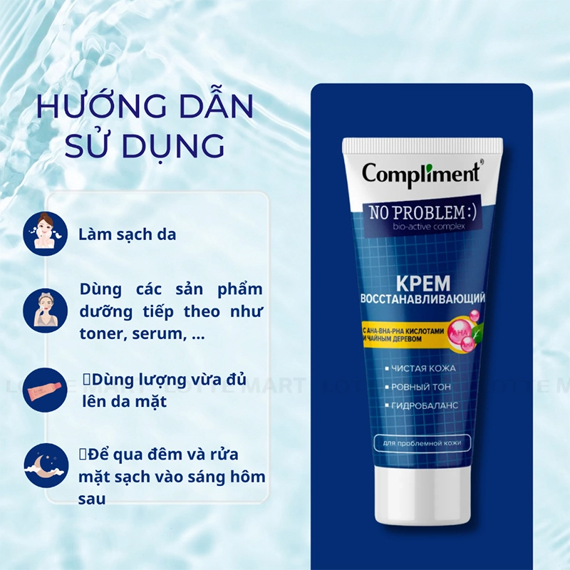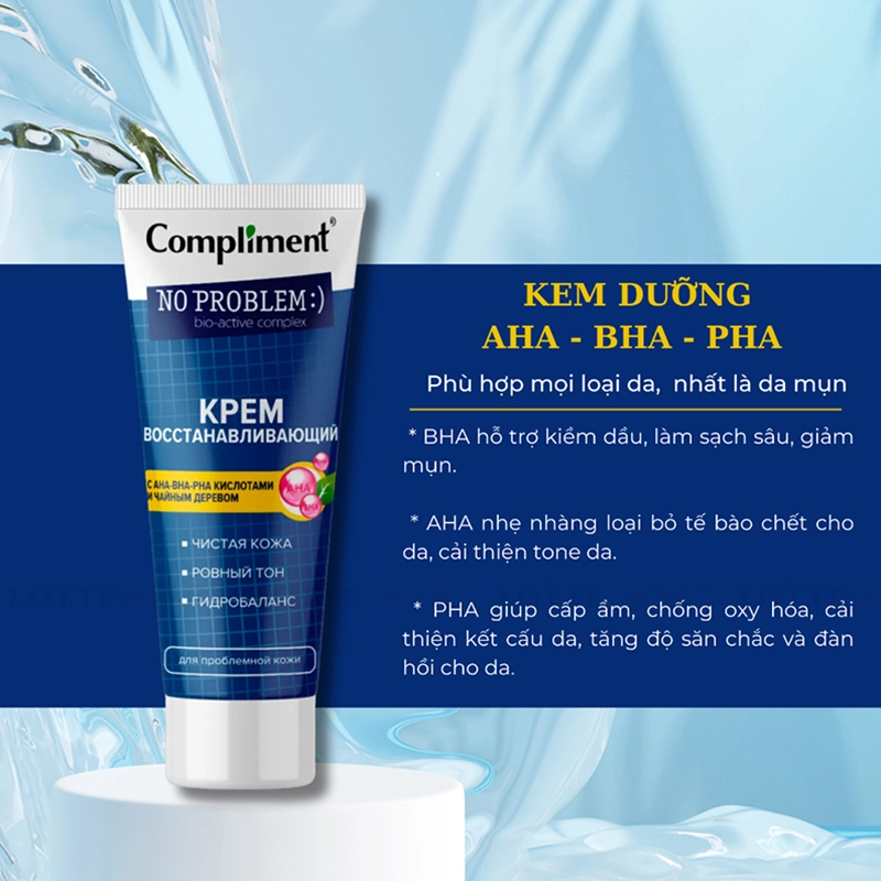 Kem Dưỡng Compliment No Problem AHA - BHA - PHA - Tea Tree là sản phẩm thuộc thương hiệu Compliment của Tập đoàn TIMEX - một trong những doanh nghiệp sản xuất mỹ phẩm lớn và nổi tiếng nhất nước Nga được thành lập từ năm 1994.