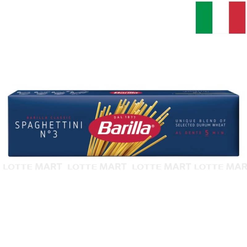 Thành phần: Bột Hòn, Bột Lúa Mì Cứng, Niacin, Sắt (Ferrous Sulfate), Sinh Tố B Mononitrate, vitamin B2, Axit Folic. Có nguồn gốc tại Naples, Mì Spaghettini sợi trung số 3 Barrilla là mỏng nhất trong tất cả các loại Spaghetti. Mảnh dẻ và nhẹ, đó là món mì được yêu thích nhất của người Ý. Thích hợp để chế biến cùng: hải sản, dầu ôliu và nước sốt cay.