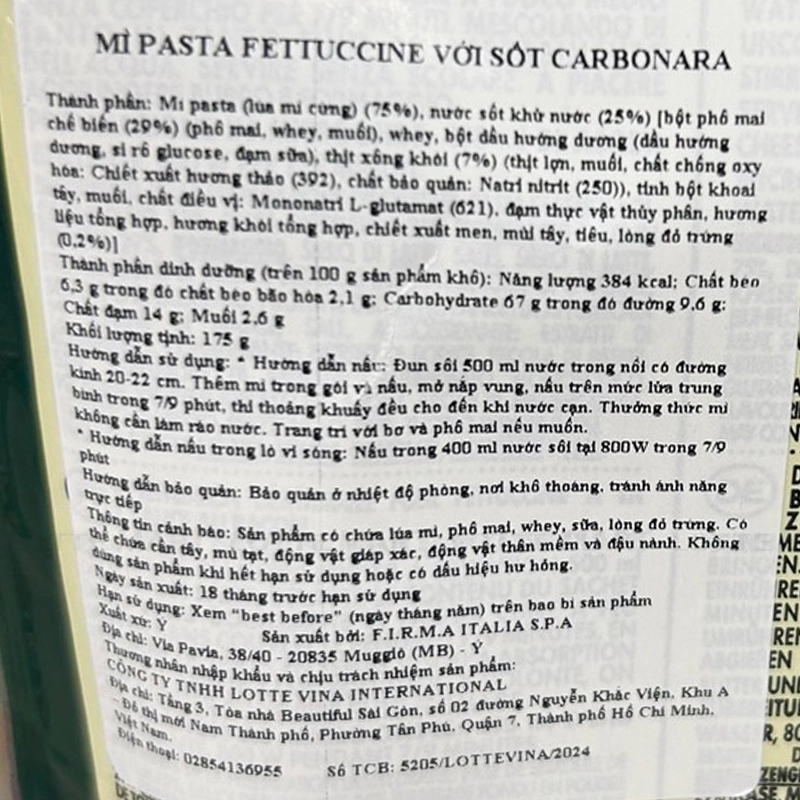• Mì pasta (lúa mì cứng) (75%), nước sốt khử nước (25%) [bột phô mai chế biến (29%) (phô mai, whey, muối), whey, bột dầu hướng dương (dầu hướng dương, si rô glucose, đạm sữa), thịt xông khói (7%) (thịt lớn, muối, chất chống oxy hóa: chiết xuất hương thảo (392), chất bảo quản: Natri nitrit))), tinh bột khoai tây, muối,...]