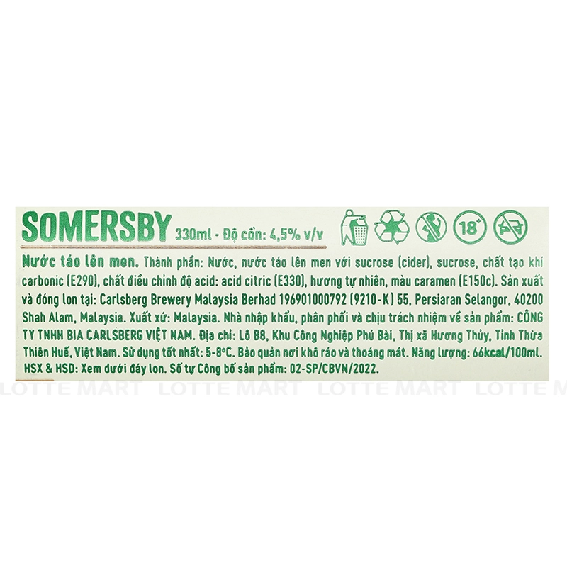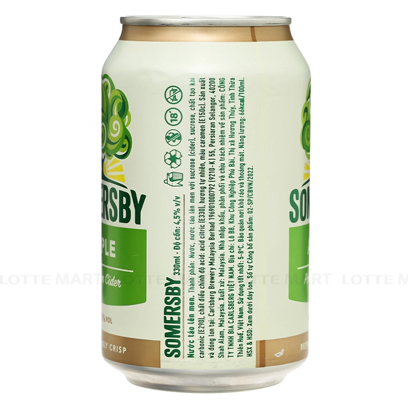 - Somersby vị táo được làm từ các thành phần tuyển chọn từ nước táo lên men với sucrose, surose, chất tạo khí carbonic, chất điều chỉnh độ acid, hương tự nhiên, màu caramenn.