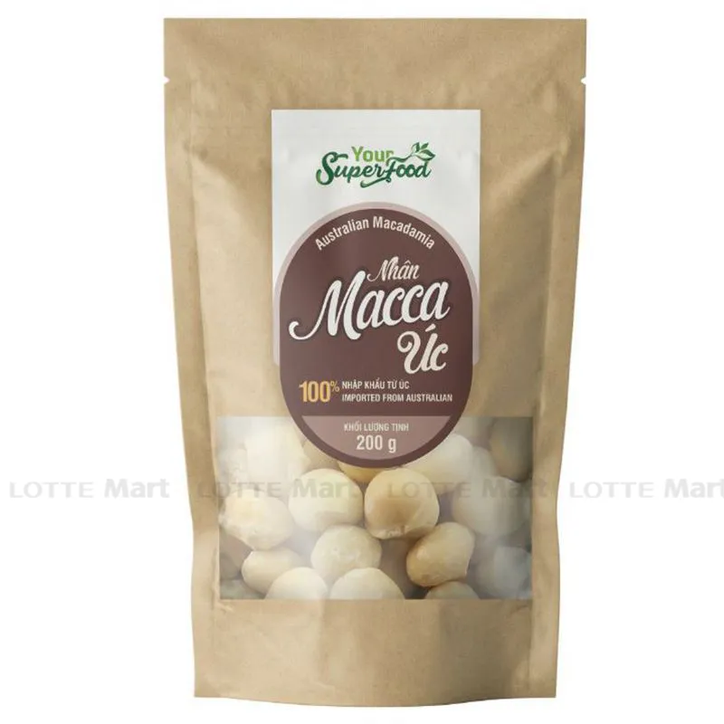 Macca Úc Your Super Food được tuyển chọn từ những hạt Macca trồng tại các nông trại đạt các tiêu chuẩn khắt khe của Hiệp hội Macca Úc. Hạt Macca tròn đều, vỏ mỏng được nứt vỏ cẩn thận rất dễ tách hạt. Macca Your Super Food sau khi thu hoạch được nứt vỏ, sấy với công thức đặc biệt giúp hạt giòn rụm, dậy vị bùi béo, thơm ngọt của hạt Macca. Cách chế biến ít gia nhiệt giúp giữ được phần lớn các chất dinh dưỡng quý giá trong hạt Macca.Hạt Macca chứa nhiều Protein, Omega 3-6, Chất xơ, các Axit Amin thiết yếu, các khoáng chất như Đồng, Sắt, Canxi rất tốt cho hệ cơ xương, hệ thần kinh, hệ tim mạch. Đối tượng nên dùng: Là món ăn vặt dinh dưỡng chăm sóc sức khỏe cho cả gia đình.Hướng dẫn sử dụng: Ăn trực tiếp hoặc kết hợp làm bánh, ngũ cốc ăn sáng.
