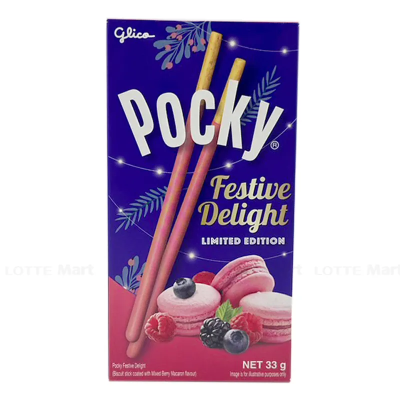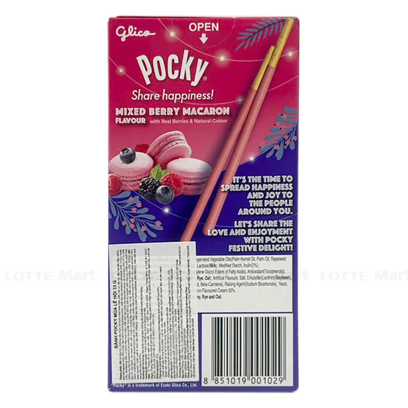 - Bánh Que Hương Lễ Hội hương vị bánh macaron quả mọng của Pocky là sự kết hợp giữa bánh que giòn ngon với nhân kem hương vị bánh macaron quả mọng hỗn hợp 50% ngọt ngào, thơm ngon tạo cảm giác thích thú khi ăn. Khi thưởng thức bạn sẽ cảm nhận trọn vẹn sự hòa quyện giữa giữa que bánh giòn rụm kết hợp với nhân kem mềm mịn, béo ngậy tạo nên một tổng thể hài hòa, hấp dẫn.