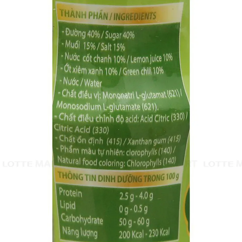 - Muối, đường, nước cốt chanh, nước, chất điều vị, ớt xiêm xanh, chất điều chỉnh độ chua, chất ổn định, phẩm màu tự nhiên.
