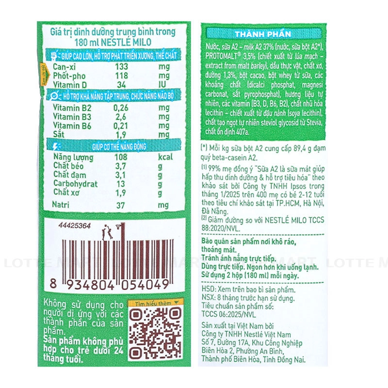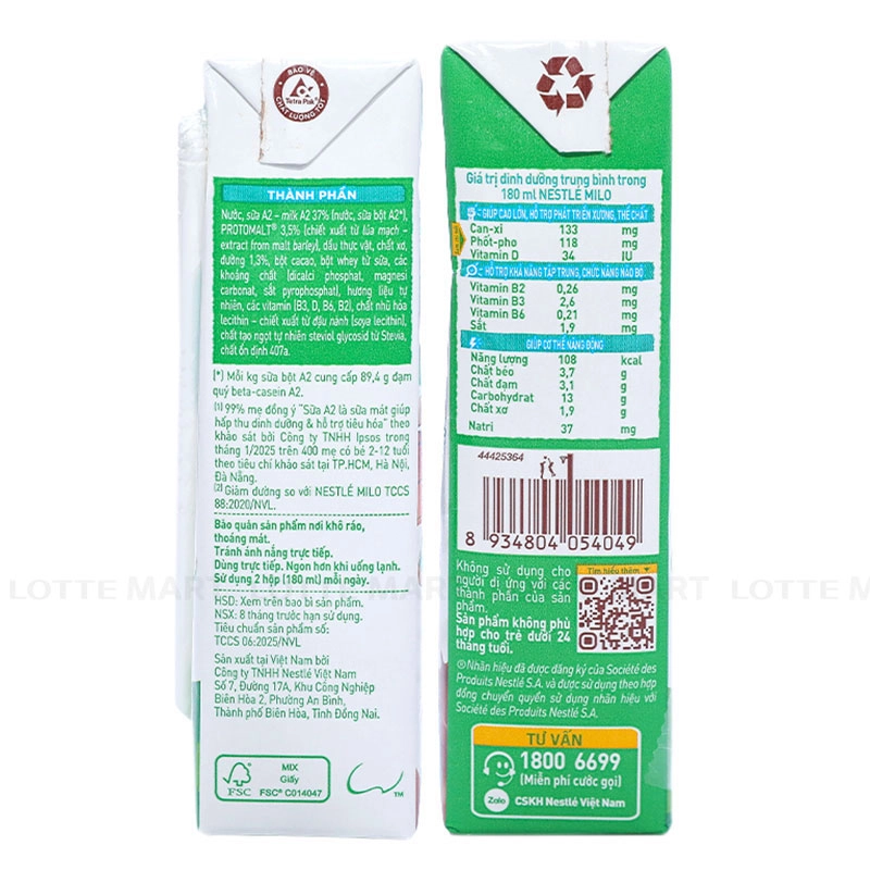 - Sữa Lúa Mạch Nestlé Milo A2 Ít Đường được phát triển với công thức đặc biệt kết hợp giữa sữa mát A2 dễ tiêu hóa và chiết xuất từ mầm lúa mạch giàu năng lượng, bổ sung đầy đủ các dưỡng chất thiết yếu như canxi, chất xơ, vitamin nhóm B, vitamin D và khoáng chất, giúp tối ưu sự phát triển toàn diện về thể chất, hệ cơ - xương, khả năng vận động và tăng cường sự tập trung.
