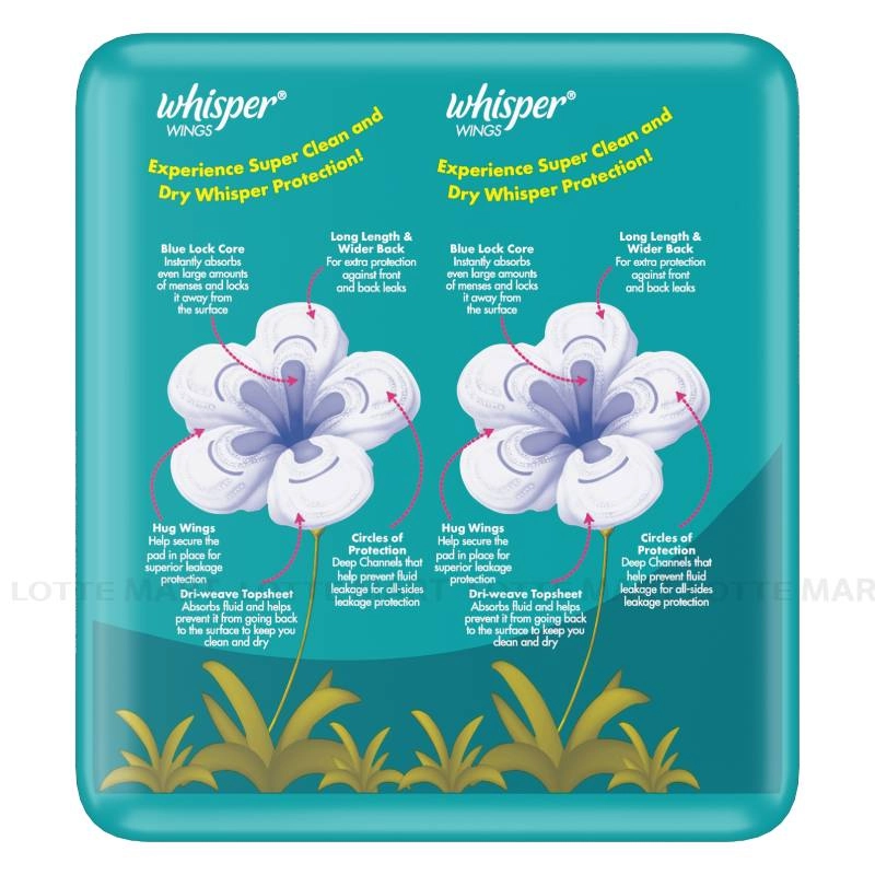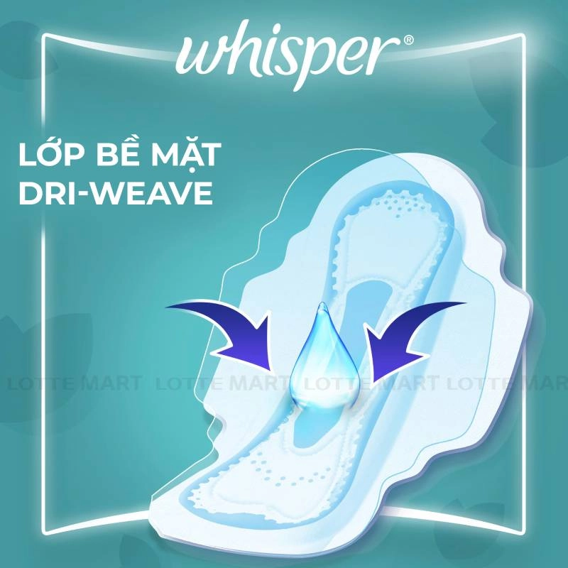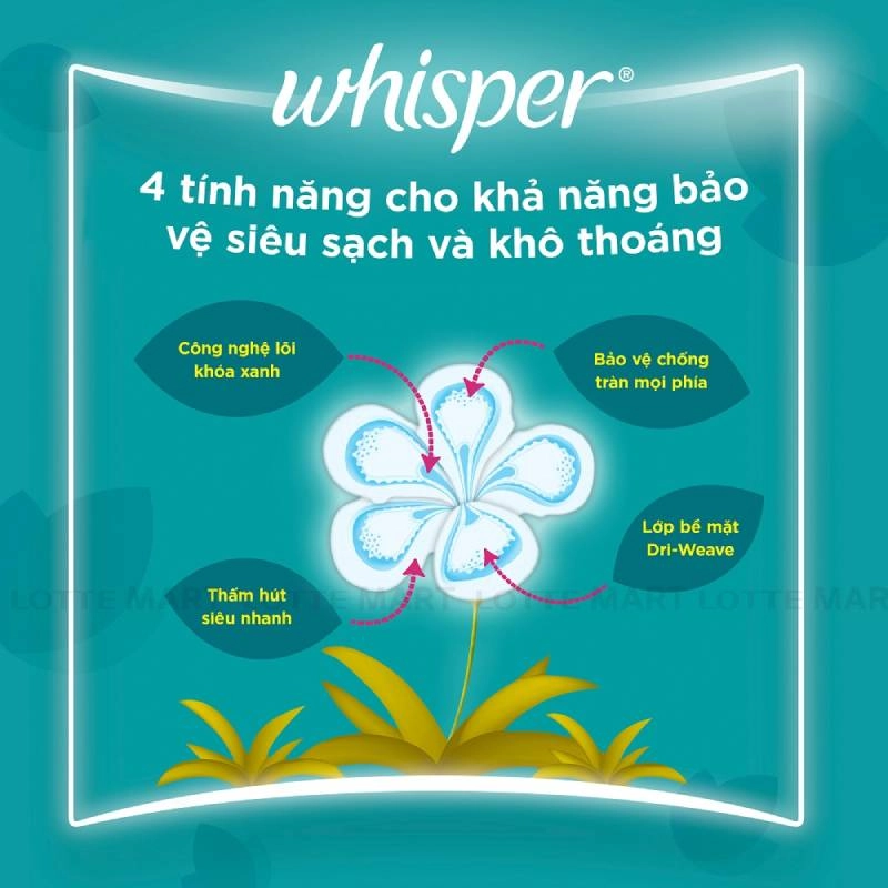 Băng Vệ Sinh Whisper Ban Đêm Có Cánh 32 Miếng thiết kế lưới thấm hút cực nhanh cho bề mặt luôn khô thoáng. Ngoài ra, sản phẩm với rãnh bảo vệ khép kín, chống thấm tràn sang hai bên và hai đầu giúp bạn gái luôn tự tin và thoải mái.