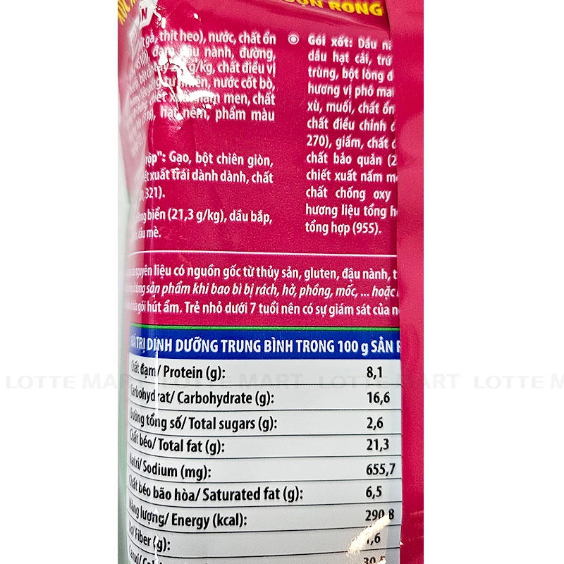- Sản phẩm chứa nguyên liệu có nguồn gốc từ thủy sản, gluten, đậu nành, trứng, cần tây.