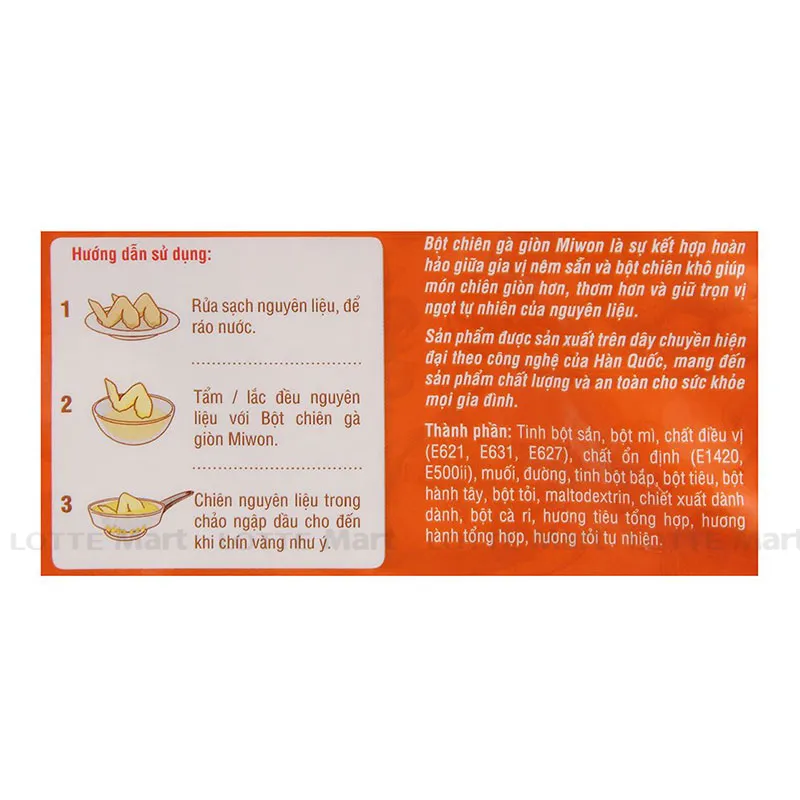 Bột Chiên Gà Giòn Miwon Gói 70G được làm từ nguồn nguyên liệu tự nhiên, an toàn và bổ dưỡng. Mang lại hương vị thơm ngon, giòn tan cho món ăn. Thành phần: Bột mì, tinh bột sắn, bột ngô, bột hành. Công dụng: Dùng để làm các món chiên, rán. Bảo quản ở nơi khô thoáng, tránh ánh nắng trực tiếp.
