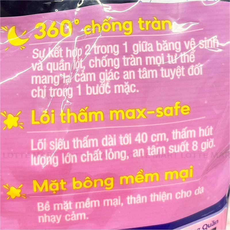 - Sản phẩm còn được thiết kế lõi thấm max-safe dài tới 44cm, thấm hút lượng lớn chất lỏng, an tâm suốt 8 giờ.