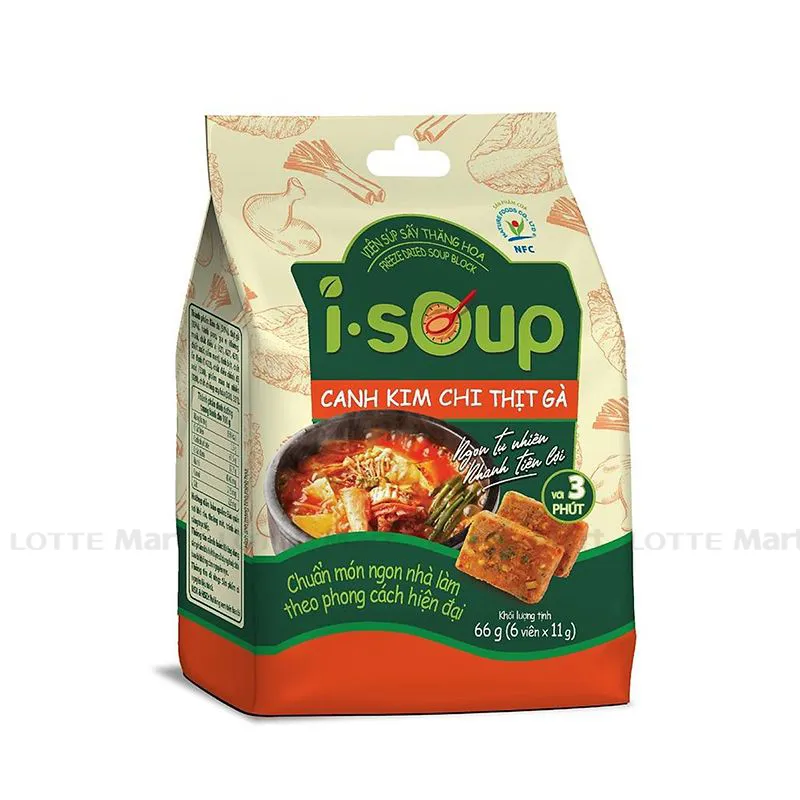 - Canh Ăn Liền Kim Chi Thịt Gà I-Soup NFC Gói 6 Viên 11G là sản phẩm ở dạng viên nén nhỏ gọn tiện lợi. Sản phẩm thuộc thương hiệu I-SOUP, là một trong những thương hiệu nổi bật trên thị trường Việt Nam với các sản phẩm canh ăn liền chất lượng và ngon miệng.